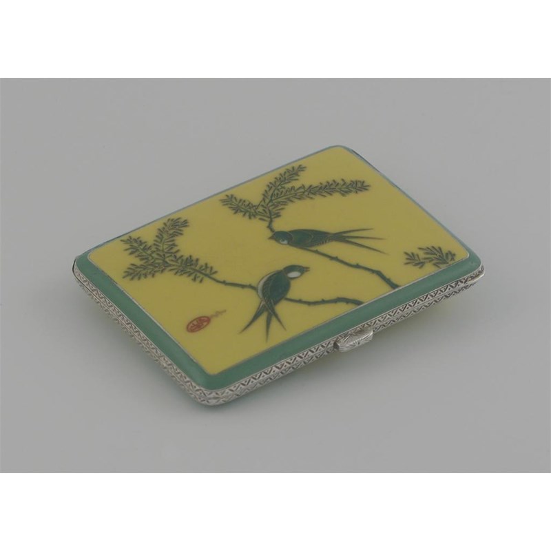 A continental cigarette case, decorated on the front and back with two swallows and branches, in yellow and green enamel, with import marks for London 1926, 3.1in (7.7cm) long.