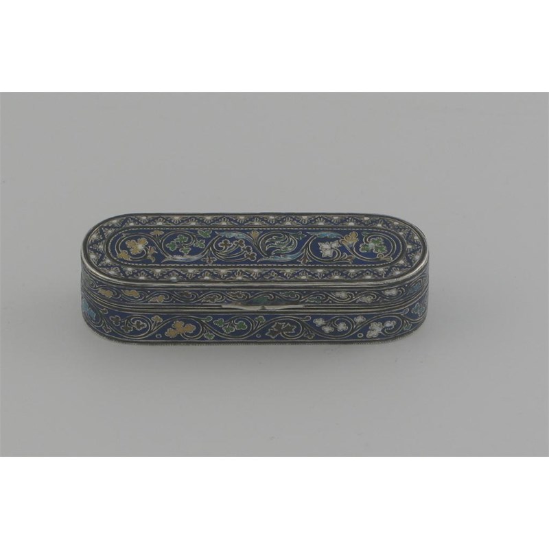 A 19th century French snuff box, rounded oblong, with cloisonne style enamel decoration all over, gilt interior, post 1838, 2.6in (6.7cm) long.