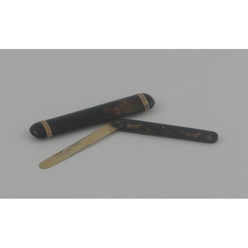 A silvergilt mounted folding fruit knife, in a tortoiseshell, coppergilt mounted case, 3.5in (9cm) long.