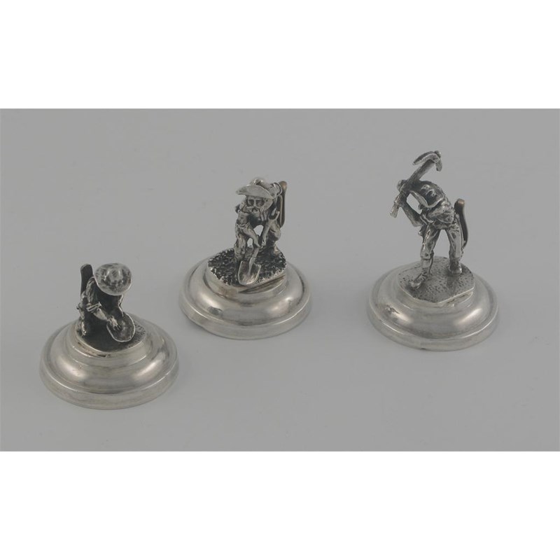 A set of three metalware menu holders, each mounted with a figure of gold miners. (3)