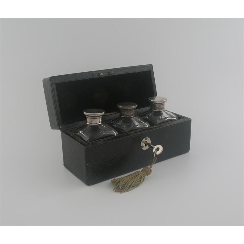 A set of three FLORIS perfume bottles, with plated screw off covers, in a fitted leather box, inset plaque initialled 'ACG', the case 7.5in (19cm) long.