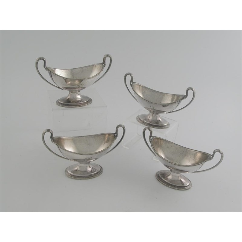 A set of four Victorian, plated, salts, boat shaped, on oval pedestal bases, with bead borders and reeded loop handles, initialled and stamped with an incuse registered design lozenge, 5.5in (14cm) long. (4)