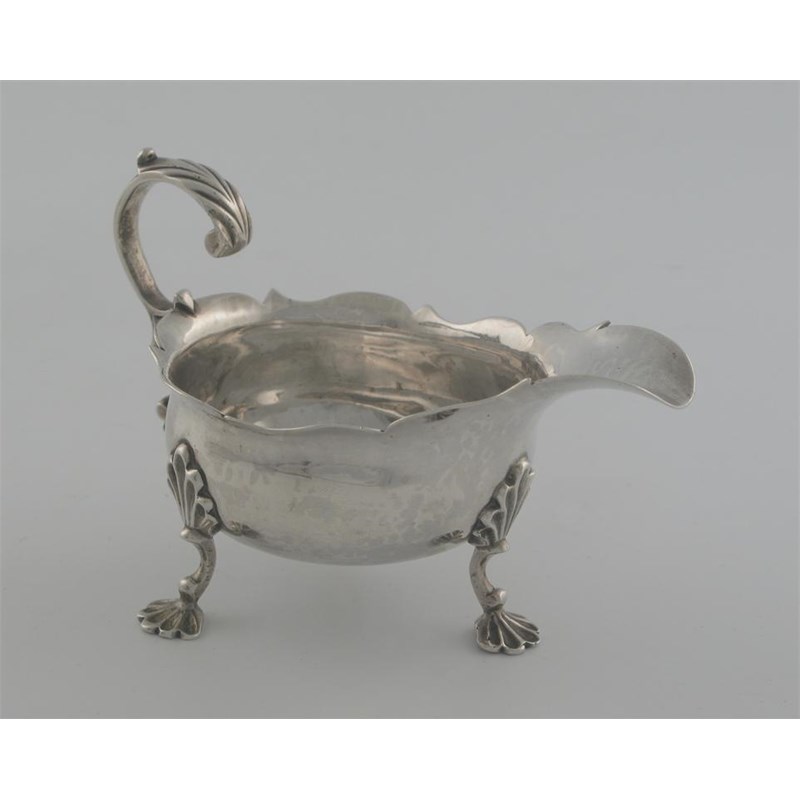 A George II cream boat, with a wavy rim and flying scroll handle, resting on three shell feet, the underside initialled 'AS', by William Shaw & William Priest, London 1754, 5in (12.8cm) long, 3.75oz.
