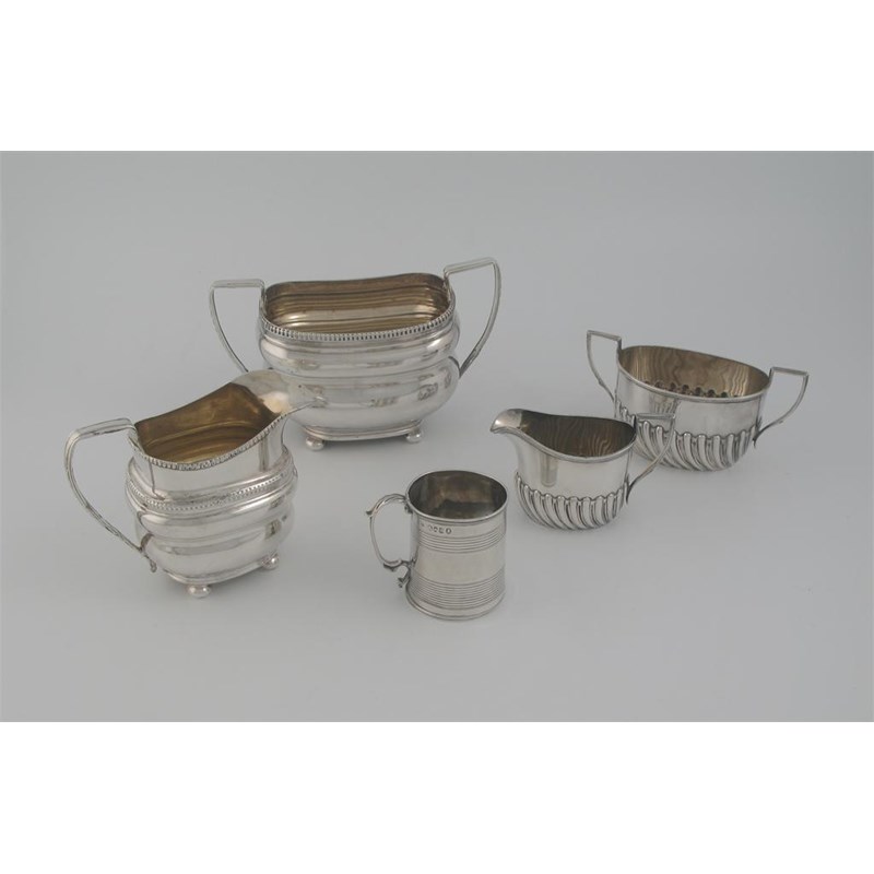 A small modern part fluted cream jug and sugar bowl, a small reeded mug, initialled, by Charles Fox, 1830, and an Old Sheffield plated sugar basin and cream jug, 8.5oz weighable silver. (5)