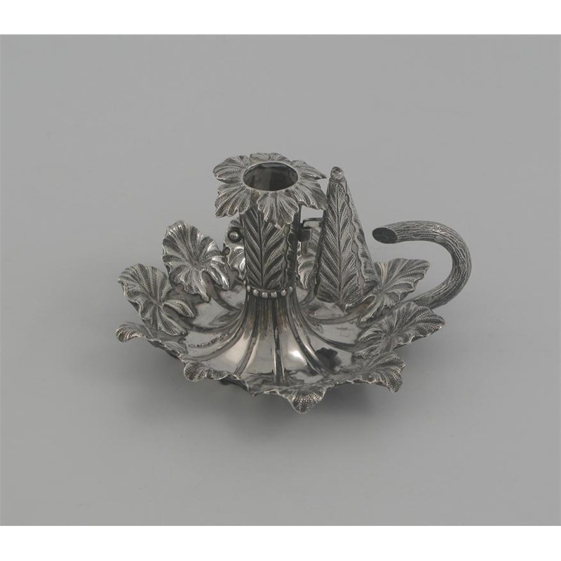 A Victorian small chamberstick, with a border of leaves, detachable nozzle, conical snuffer, by Yapp & Woodward, Birmingham 1848, 3.75in (9.5cm) diameter, 2.25oz.
