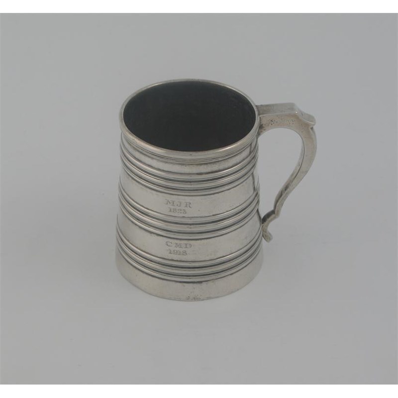 A rare early 19th century Chinese tapering mug, with reeded hoops around the body, initialled 'MJR 1823' and 'CMD 1918', with pseudo marks (for Messrs Eley, Fearn & Chawner, London 1810) 3.25in (8.2cm) high, 8oz.