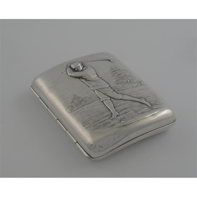 An Edwardian cigarette case, embossed on the front with a golfer about to take a swing, by H. Matthew, Birmingham 1902, 3.3in (8.4cm) long, 3oz.