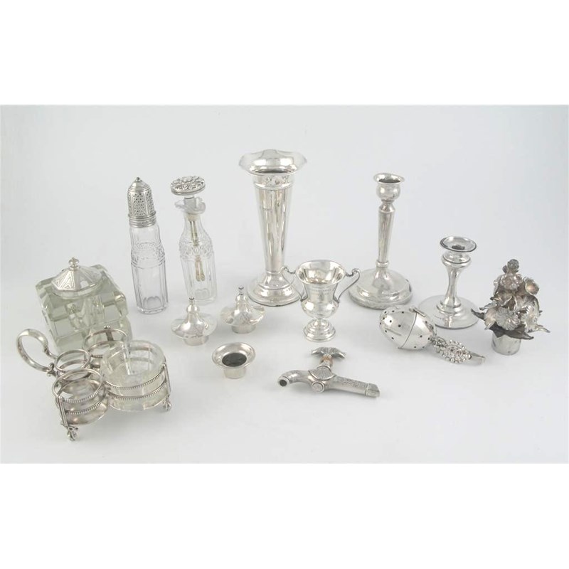 A mixed lot: two single modern candlesticks, a vase, a miniature cup, a glass inkwell, an inkwell mount, three various candelabra finials, a spigot, a nozzle, an infuser, two mounted glass condiment bottles and a Victorian breakfast cruet frame (one glass liner), 20oz weighable silver. (Lot)