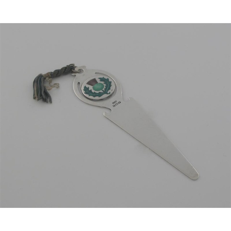 A modern book mark, with an enamelled thistle on the terminal, by Turner & Simpson, Birmingham 1948, 4.25in (10.8cm) long, 0.5oz.