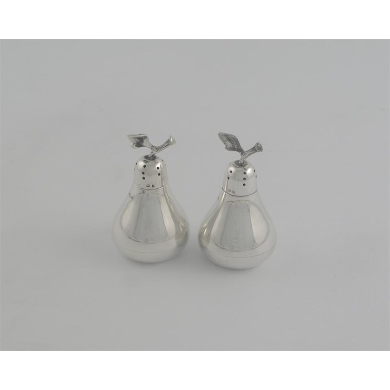 A pair of modern novelty pepperettes, in the form of pears with leaf and stalk finials, by Kemp Brothers, Birmingham 1919, 2.5in (6.45cm) high, 1oz. (2)