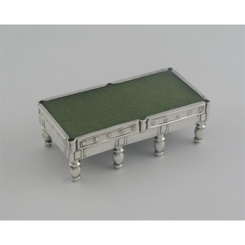 A modern novelty, snooker table pin cushion, on eight turned legs, by T. H. Hazelwood, Birmingham 1910, 3.5in (9cm) long.