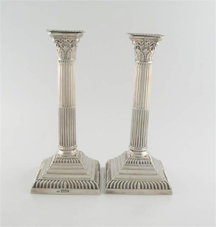 A pair of Victorian Corinthian column candlesticks, with gadrooned borders, detachable nozzles, loaded bases, by Mappin & Webb, Sheffield 1895, 10.1in (25cm) high. (2)
