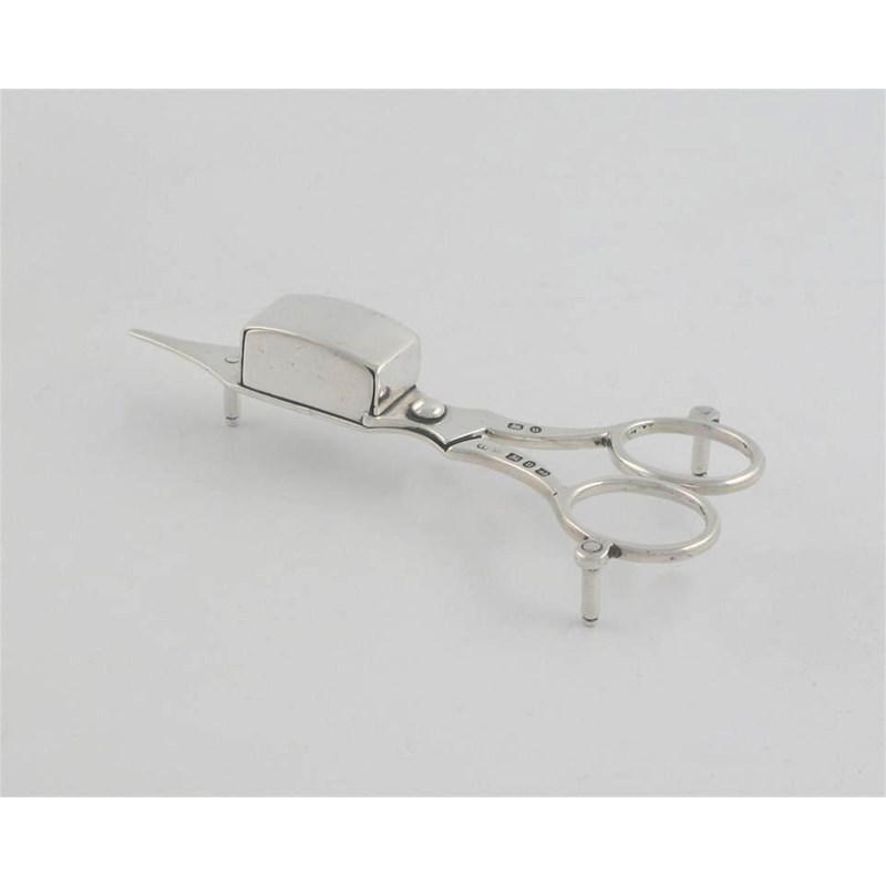 A late Victorian cigar cutter, in the form of a pair of scissor snuffers, by H. Matthews, Birmingham 1894, 4.5in (11.4cm) long, 1.25oz.