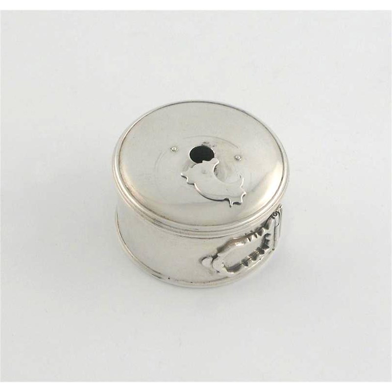 A George III small circular bougie box, with a lift-off cover, swing-out handle and a swivel cutter on the top, crested, by Edward Darvill, London 1775, 1.9in (4.8cm) diameter, 1.5oz.