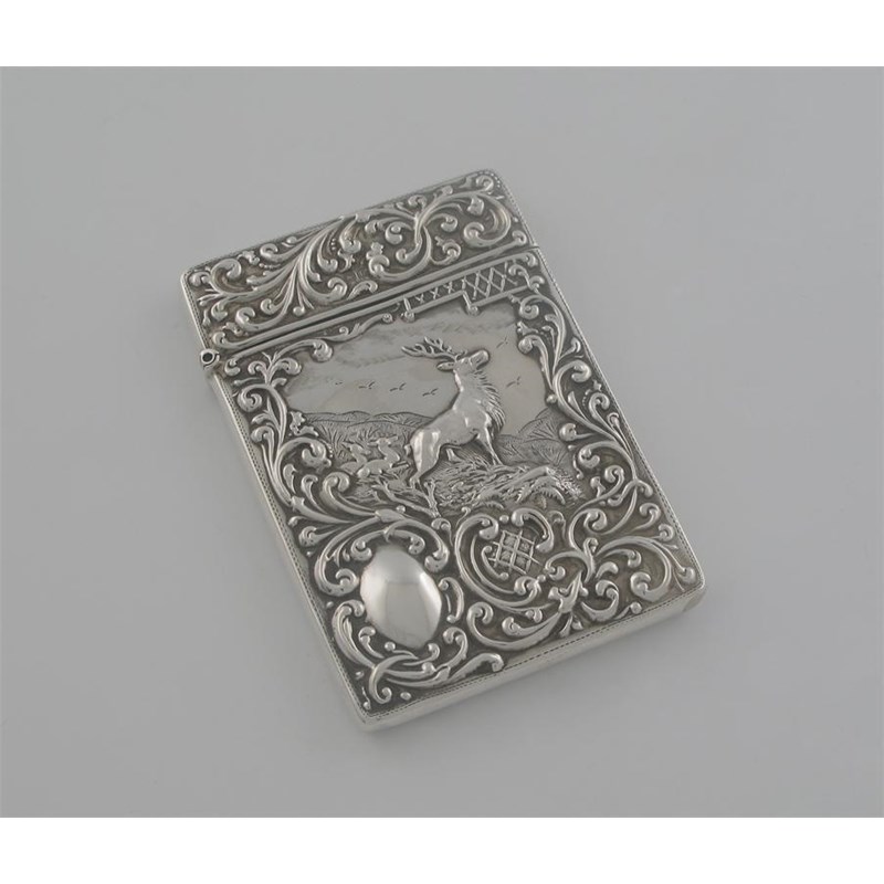 An Edwardian oblong card case, embossed on one side with a 'stag at bay' flanked by scrollwork and a vacant cartouche, by Crisford & Norris, Birmingham 1907, 4in (10cm) high, 1.5oz.