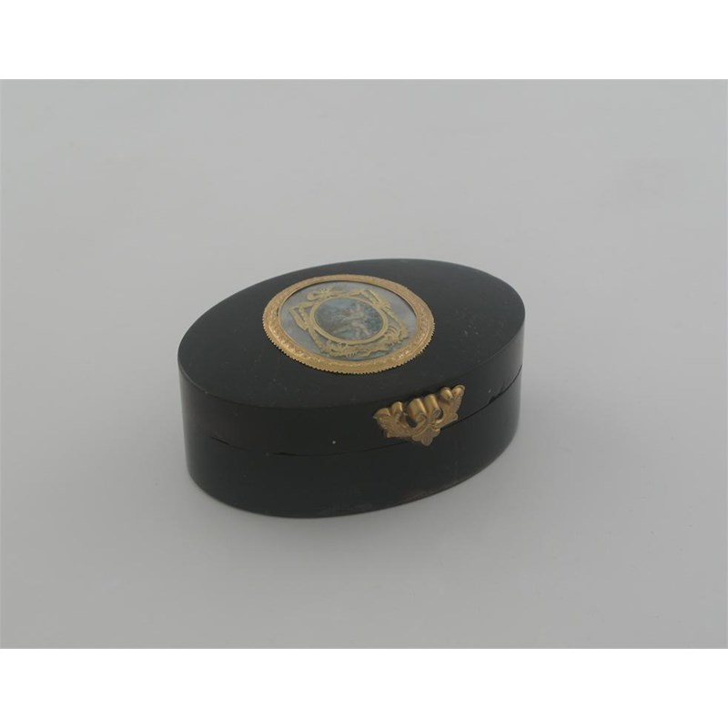 An oval tortoiseshell snuff box, with gilt metal and gold mounts, the cover inset with a framed, miniature painting of a putto, behind glass, unmarked, late 18th century, probably French, 3.25in (8.2cm) long.