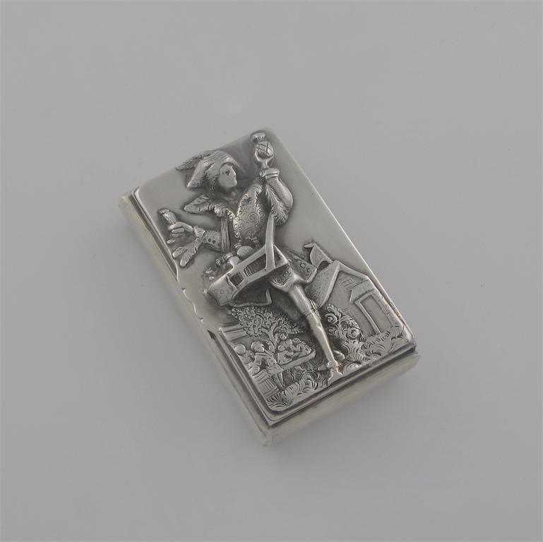 A plated pedlar snuff box, 3.35in (8.5cm) long.