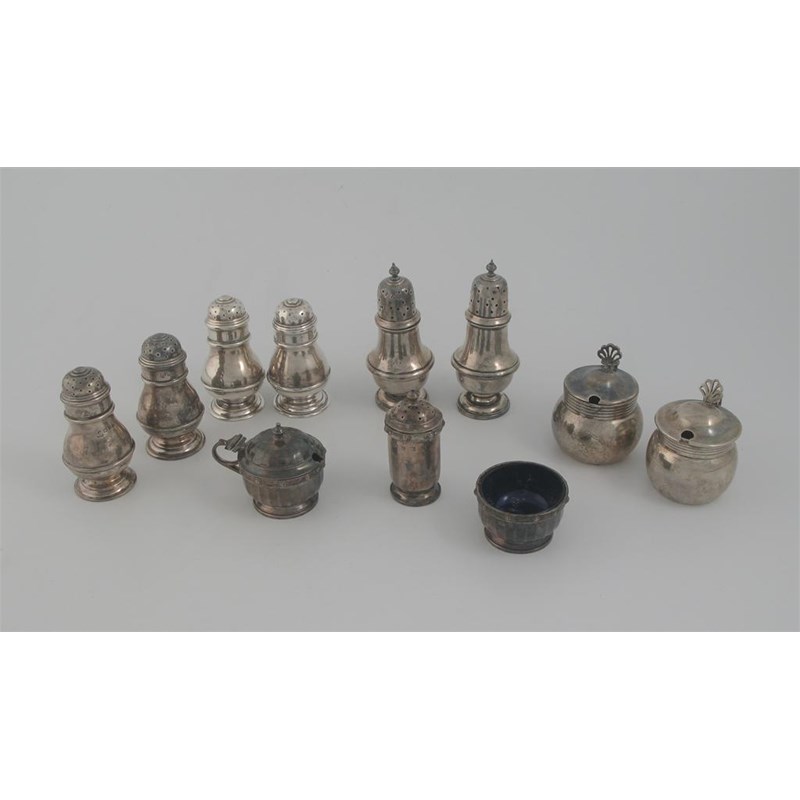 Various modern condiments: four bun-top peppers, two vase-shaped peppers, a three piece condiment set with Celtic borders (blue glass liners), and two squat mustard pots, 12oz weighable silver. (11)