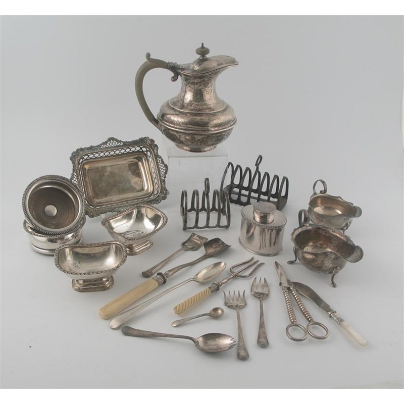 A mixed lot: a modern hot water jug, two sauce boats, a toast rack, a bon bon dish, and the following plated items: a pair of salts, a pair of small coasters, a tea caddy, a toast rack, and sundry flatware and cutlery, 29oz weighable silver. (Lot)