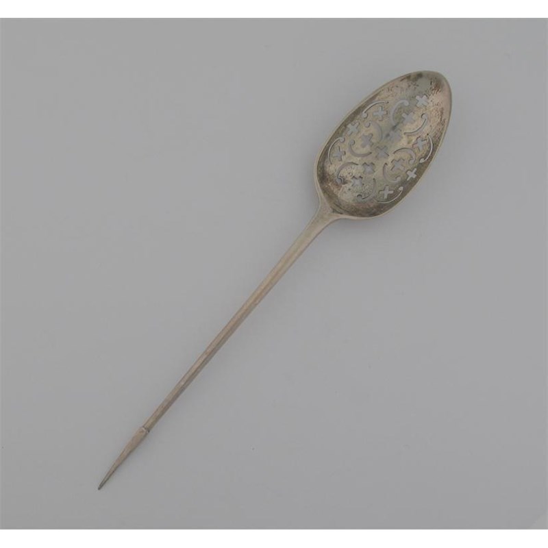 A George III mote spoon, with a dessert size bowl and a large tapering finial, by an unascribed maker 'FE', London c.1780 (no date letter), 6.9in (17.5cm) long.