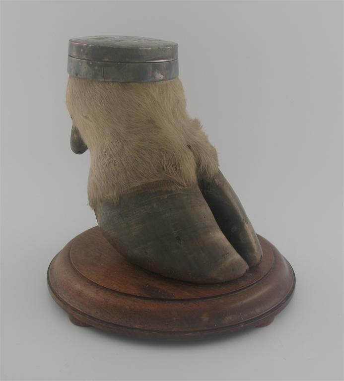 A modern plated snuff mull, with a hinged cover, engraved with 'Karsala 1936', mounted on an ox foot and circular wood plinth.