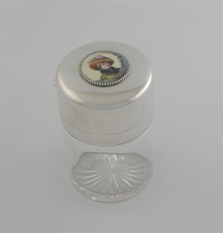 A late 19th/early 20th century American mounted cut glass smelling salts bottle, cylindrical with a hinged cover, decorated with an enamel portrait of a lady, the interior with stopper, by Gorham & Co., 4.1in (10.5cm) high.