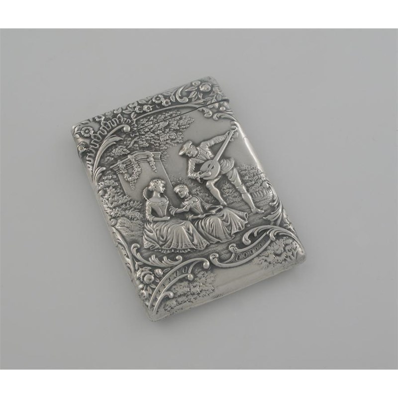 An Edwardian card case, embossed with a minstrel serenading two girls on one side and a garden scene on the other, maker's mark mis-struck, Birmingham 1904, 4.1in (10.5cm) high, 2.5oz.
