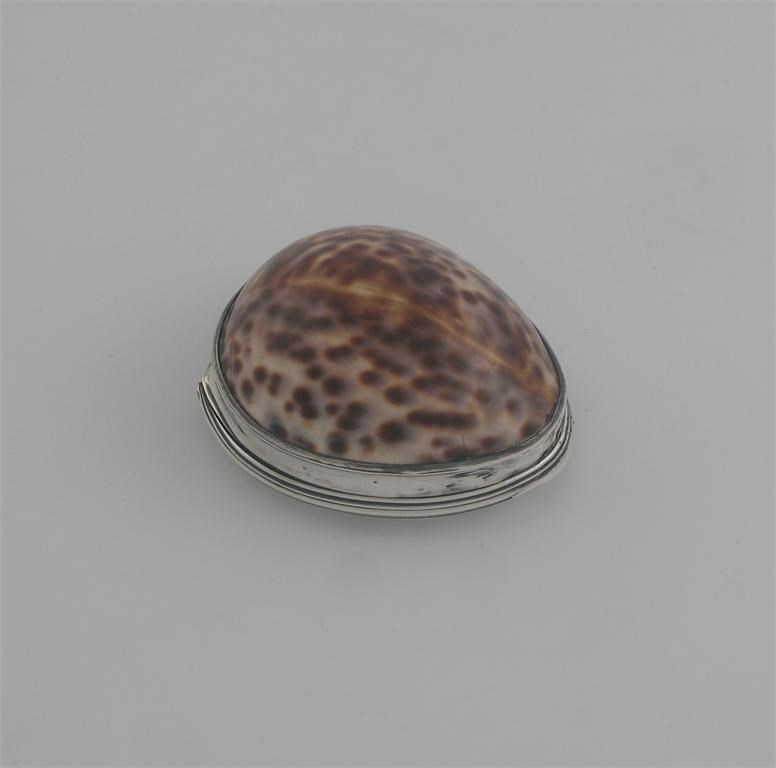 A George III mounted cowrie shell snuff box, initialled 'H', the interior of the cover gilt, by T. Phipps & E. Robinson, London 1795, 2.9in (7.2cm) long.