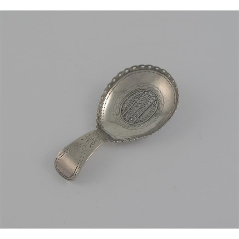 ** A George III engraved caddy spoon, with a pierced rim and an inset filigree panel in the bowl, by Cocks & Bettridge, Birmingham c.1804.