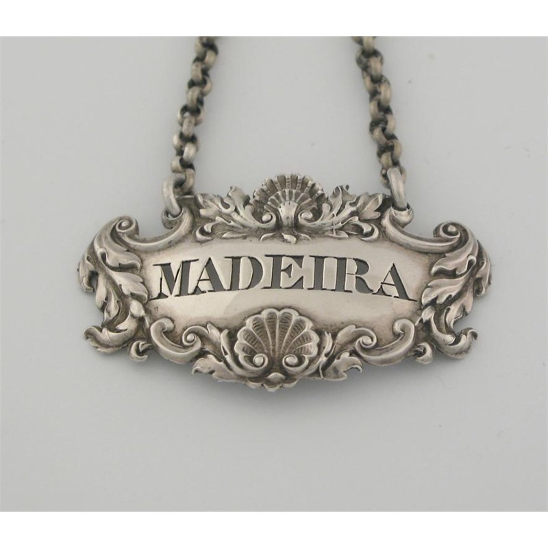 A William IV escutcheon wine label, with a scrolling and shell border, pierced 'MADEIRA', by Reily & Storer, London 1836.