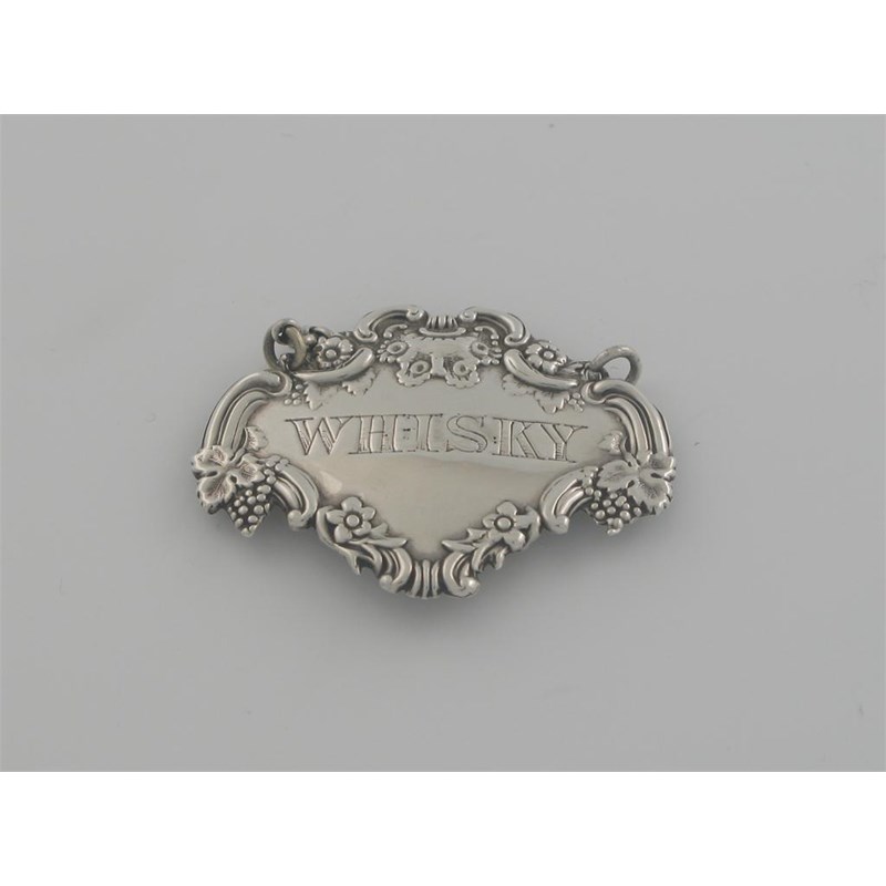 A George III/William IV Scottish escutcheon wine label, scrolling vine and flower border, incised 'WHISKEY', by William Cunningham, Edinburgh c.1825-30.