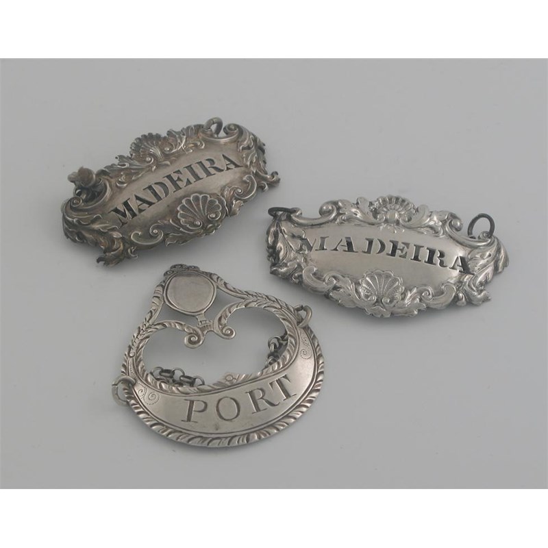 A George III crescent wine label, with a feather edge with openwork surmount, oval cartouche, incised 'PORT', London c. 1780, makers mark 'IP', a George III cartouche wine label pierced 'MADEIRA' with a shell and scroll border, by Reilly and Storer, and a similar plated example. (3)
