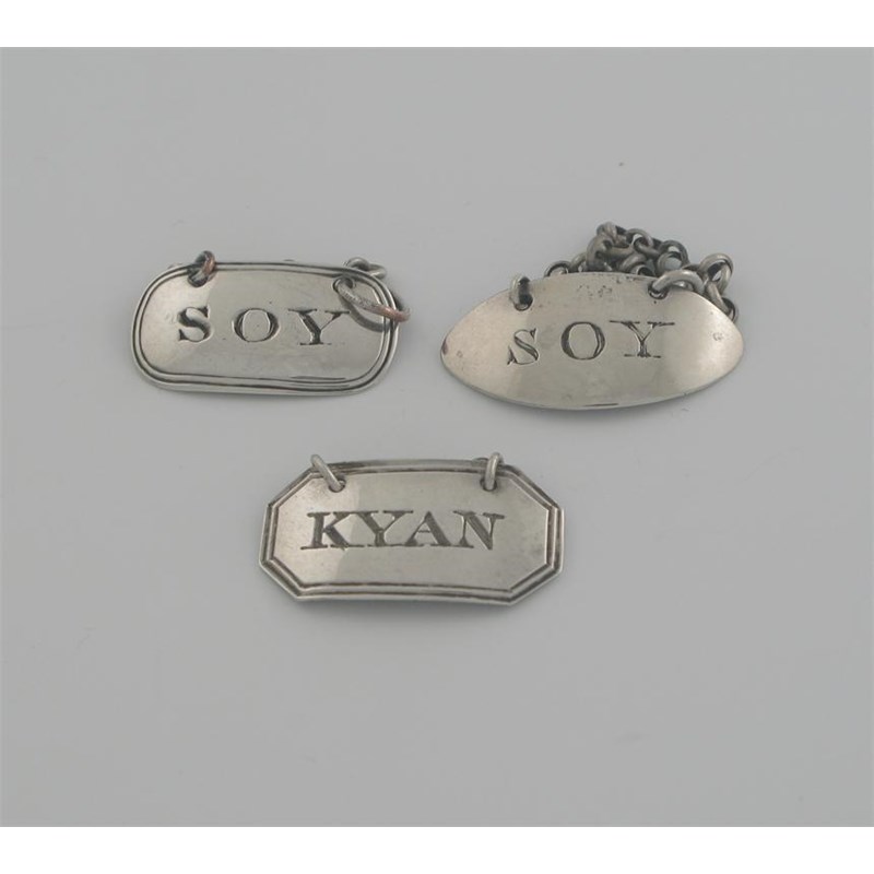 Three George III sauce labels, 'KYAN', by Josiah Snatt, London 1807, 'SOY', by John Rich, c.1770, and a navette shaped 'SOY' label. (3)