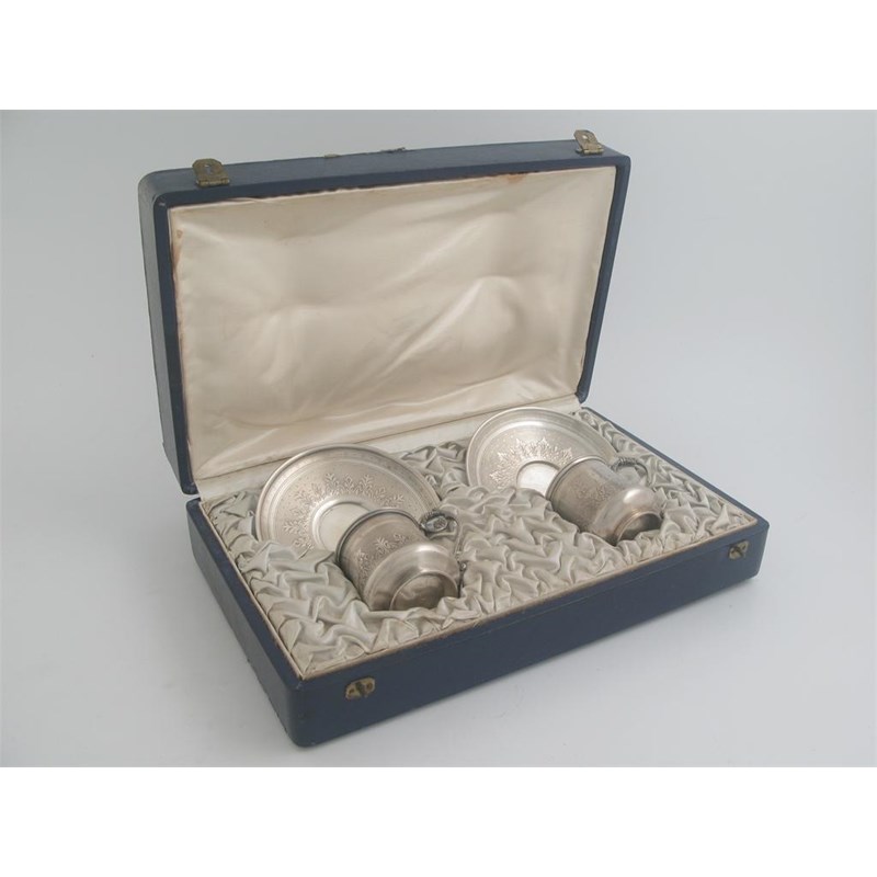 A cased pair of 19th century French demi-tasse coffee cups and saucers, with engine turned decoration, initialled, Paris post c.1838, the saucers 4.6" (11.6cm) diameter, 7oz.