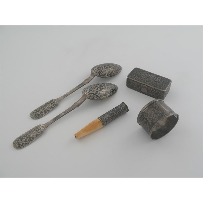 Late 19th century Russian niellowork: a snuff box with Cyrillic lettering on the cover, 2.5in (6.5cm) long, two fiddle pattern dessert spoons, a napkin ring and a mounted meerschaum cheroot holder, various makers and dates, 5.25oz weighable silver. (5)