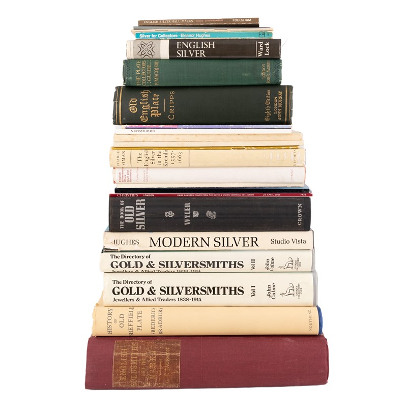 including: Culme, J., The Directory of Gold and Silversmiths, The Antique Collectors Club, 1987, 2 Vols., plus The History of Old Sheffield Plate, Modern Silver, English Goldsmiths and Their Marks, by Jackson, English Silver in the Kremlin and other volumes. (qty)