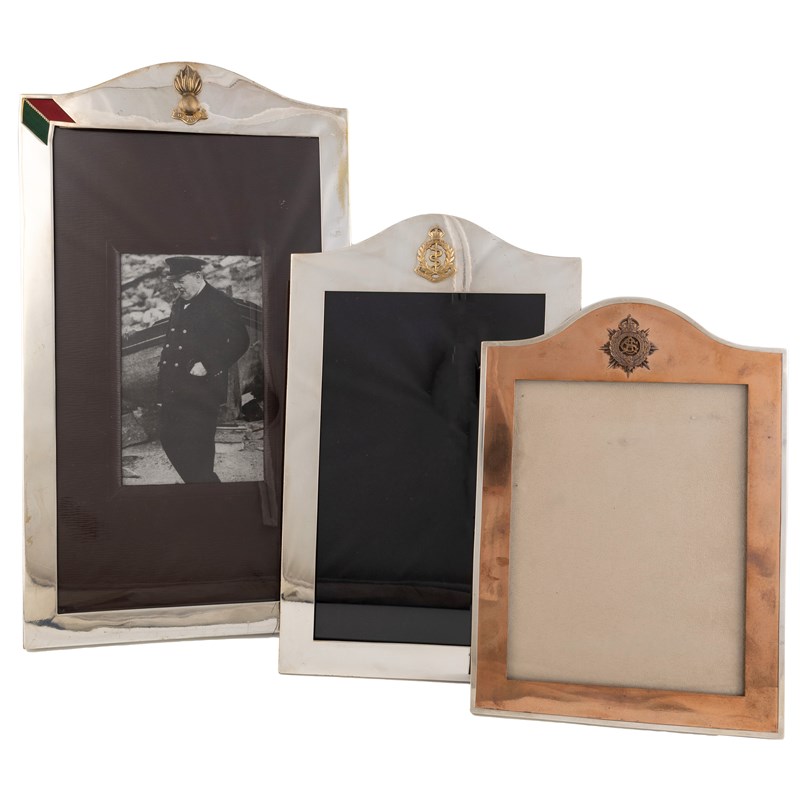 shaped rectangular form, with an applied Army Service Corps cap badge, plus an Asprey electroplated photograph frame with an applied Royal Army Medical Corps cap badge and an electroplated photograph frame with an applied Royal Engineers badge, height 45.6cm. (3)