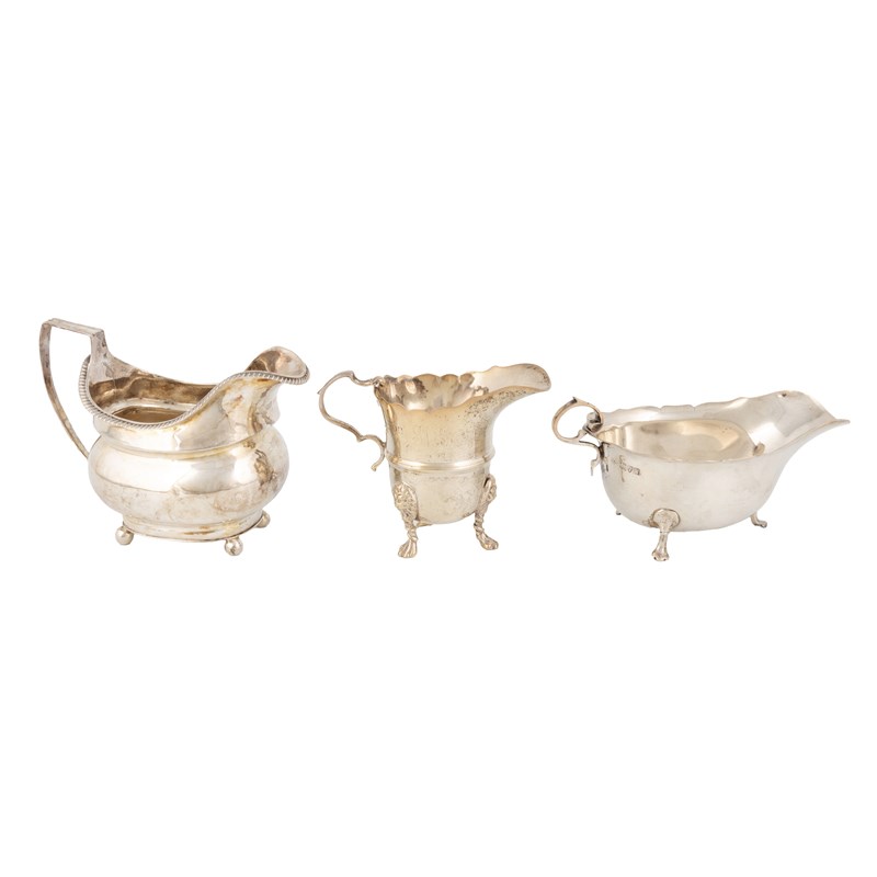 oval form with a scalloped edge, on three hoof feet, length 14.5cm, plus a George III silver cream jug probably by Thomas Dicks, London 1813, and a cream jug by Goldsmiths and Silversmiths, London circa 1910, total approx. weight 10.2oz. (3)