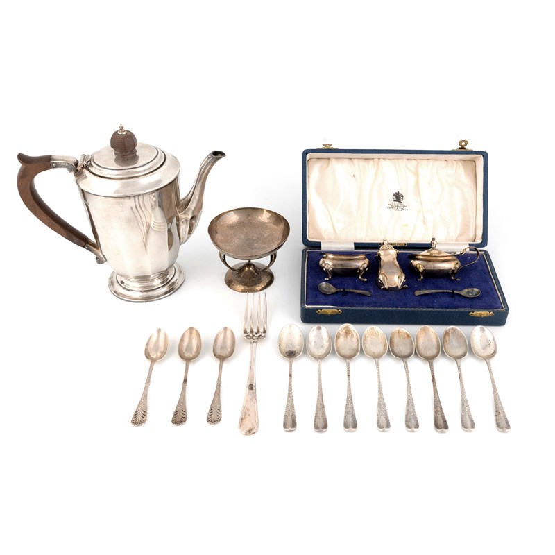 comprising: a modern silver coffee pot by Mappin & Webb, Sheffield 1965, a cased three-piece cruet set, a presentation tazza, a set of eight teaspoons and three others, plus an electroplated fork, total approx. weight 29.6oz. (19)