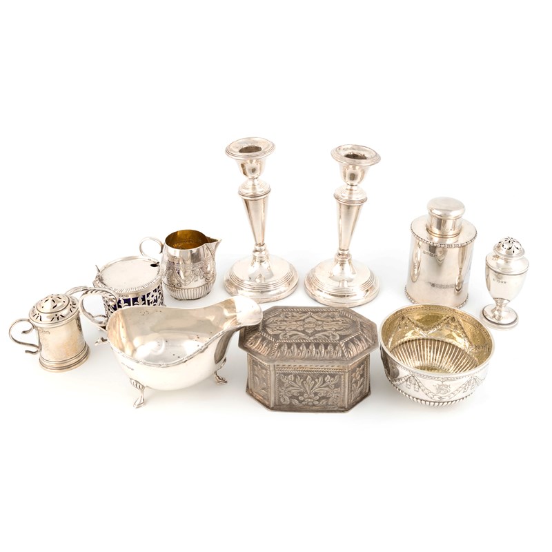 comprising: a matched Victorian silver cream jug and sugar bowl by Henry Holland, London 1878, a tea caddy, a pepperette, a sugar caster, a sauce boat, a mustard pot and a pair of candlesticks, plus a metalware tea caddy, total approx. weighable 22.1oz. (10)