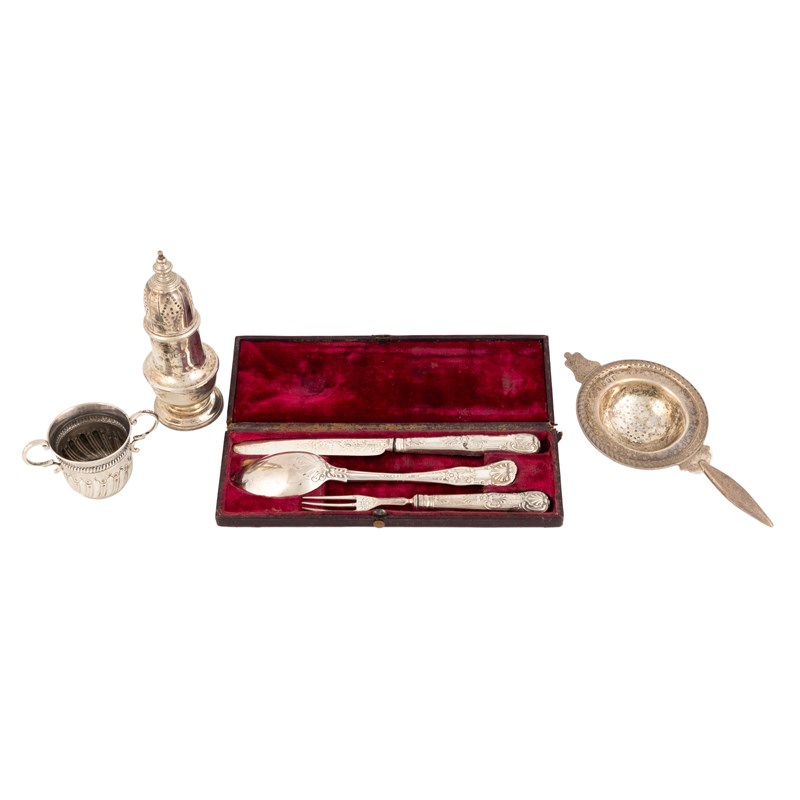 comprising: an Edwardian Irish tea strainer by Edmond Johnson Ltd, Dublin 1902, a small George III porringer, a pepperette and a cased three-piece christening flatware set, total approx. weighable 7.1oz. (6)