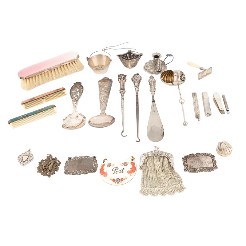 comprising: a Victorian miniature leaf chamberstick, by Joseph Willmore, Birmingham 1841, a shell sifting spoon, two wine labels, a needle case, a tooth pick, a box, two button hooks, a shoe horn, a fruit knife, plus other items and electroplated items, approx. weighable 3.8oz. (qty)