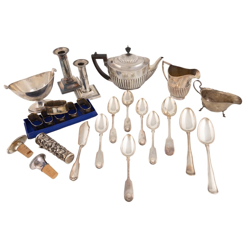 comprising silver items: a Victorian teapot, by The Barnards, London 1892, a cream jug, a candlestick, a set of six Fiddle and Shell pattern dessert spoons, a tablespoon, two Danish tablespoons, a butterknife, a set of six Scandinavian napkin rings, two bottle stoppers, a sauce boat, and an unmarked scent bottle, plus an old Sheffield plated sugar basin and an electroplated candlestick, approx. weighable 41oz. (qty)