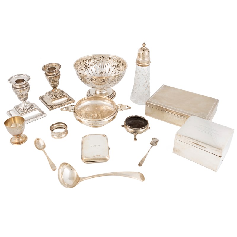 comprising: a pair of Victorian dwarf candlesticks, by Martin, Hall and Co., London 1886, a two-handled bowl, by A.E.Jones, Birmingham 1923, a small rose bowl, two cigarette boxes, a silver-mounted glass sugar caster, an egg cup, a cigarette case, a salt cellar, a ladle, a napkin ring and two spoons, approx. weighable 21.5oz. (qty)