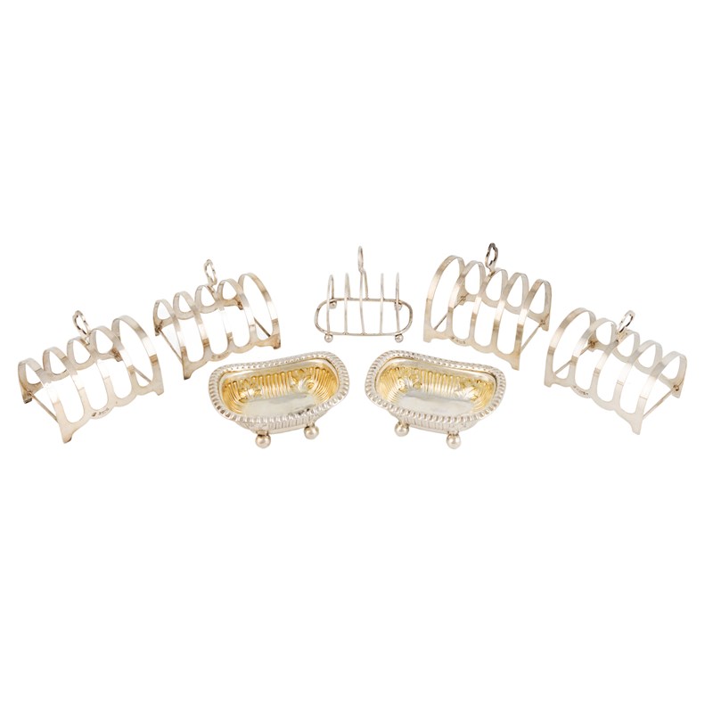 comprising: a matched set of four silver toast racks by Charles S Green & Co Ltd, Birmingham 1972 and 1973, and another toast rack, plus a pair of George III silver salt cellars by William Tucker & Co, Sheffield 1815, total approx. weight 12oz. (7)