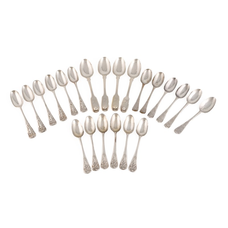 engraved with crests to the terminals, plus a set of six silver teaspoons with a classical woman to the terminals, a set of six silver scroll-back teaspoons, and a set of five silver teaspoons with another similar, total approx. weight 11.9oz. (22)