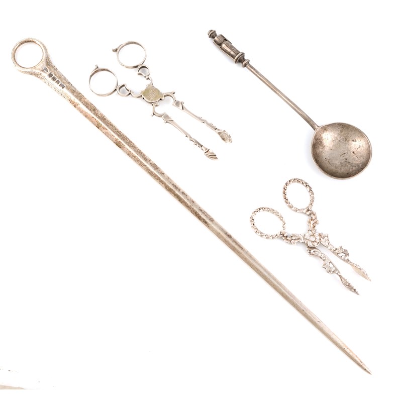 comprising: a George III meat skewer, by William Summers, bright-cut decoration, engraved with a crest, an Arts and Crafts spoon, by William Hutton and Sons, Sheffield 1912, the cover with a female figure wearing a hat, with one elongated arm, spot-hammered bowl, and two pairs of sugar nips, approx. weight 6.3oz. (4)