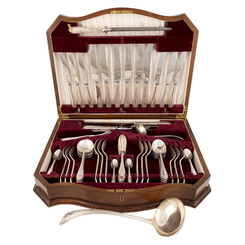 conventional form with engraved foliate decoration, comprising: six dessert spoons, six soup spoons, two tablespoons, six table forks, six fish knives, six teaspoons, six coffee spoons, eleven dessert forks, a sauce ladle, a soup ladle, six dessert knives, six table knives and a carving set, total approx. weighable 90.4oz. (64)