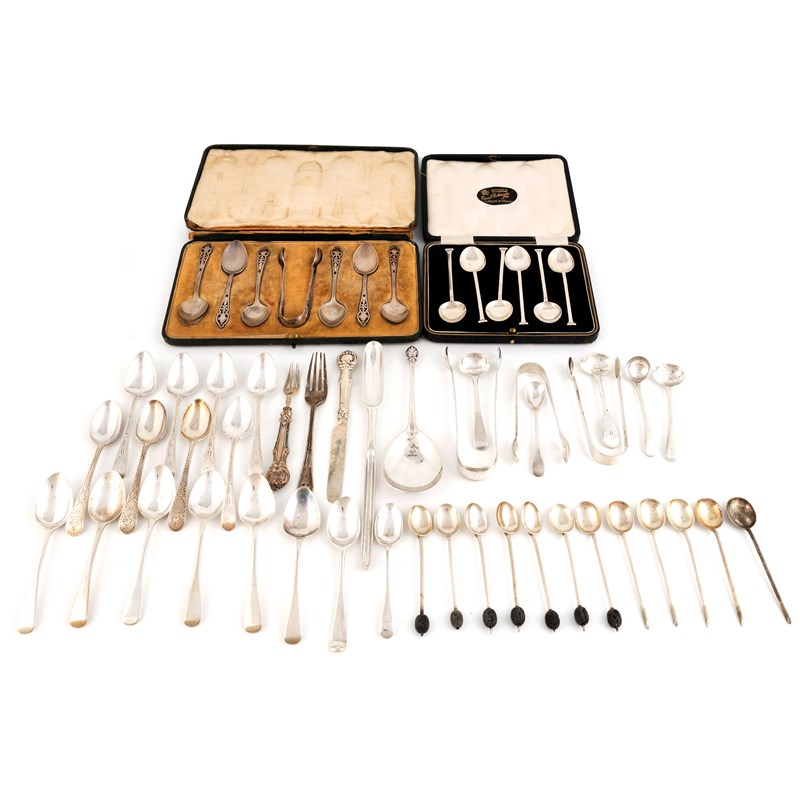 comprising: a George II marrow scoop, by Samuel Roby, London 1746, the reverse of the bowl with two crests, a continental spoon, unmarked, three pairs of sugar tongs, a set of six teaspoons, London 1818, eight Bright-cut teaspoons, various condiment spoons, a christening knife and fork, plus two cased sets of spoons, and various other items, approx. weighable 20oz. (qty)