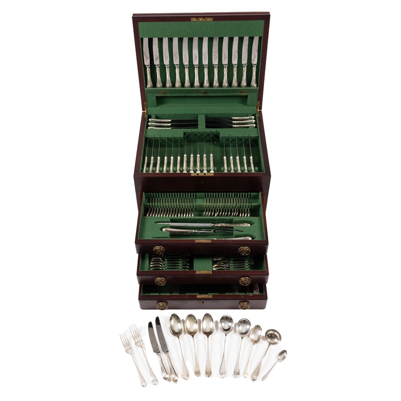 comprising: eighteen table forks, eighteen table knives, eighteen dessert forks, eighteen dessert knives, eighteen soup spoons, eighteen dessert spoons, eighteen teaspoons, six tablespoons, a soup ladle, two sauce ladles, and a three-piece carving set, in a fitted wooden case with three drawers and a hinged cover, approx. weight 200oz. (qty)